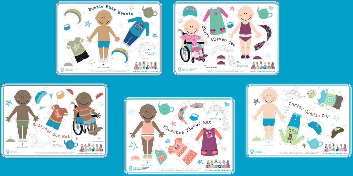These 5 beautiful, fun charters, each with a different skin colour and a selection of headwear help children to therapeutically play through the hair loss journey. You can download the sheets from the link below or contact or email us at: support@cancerhaircare.com for a printed pack sent in the post.